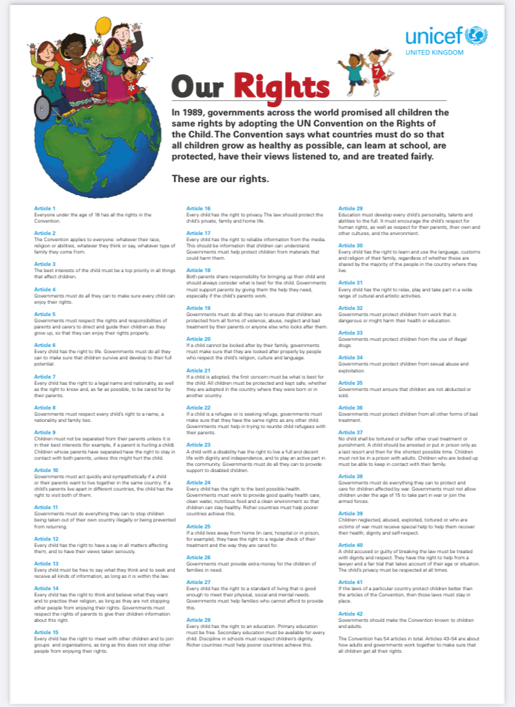 | How can I get involved? | We hope you will support the school’s journey to become a Unicef UK Rights Respecting School. Please do read about the Convention and Unicef’s work (see below) to see what it’s all about! |